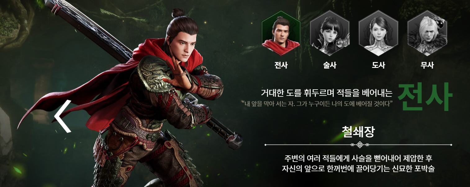 | 1. 전사 - 거대한 도를 휘두르며 적들을 베어낼 수 있는 전사입니다. 2. 술사 - 원소의 힘으로 불과 얼음을 자유롭게 다를 수 있는 술사입니다. 3. 도사 - 우리의 생명을 지켜주는 도사입니다. 4. 무사 - 긴 창으로 원거리의 적들을 관통하는 무사입니다. |