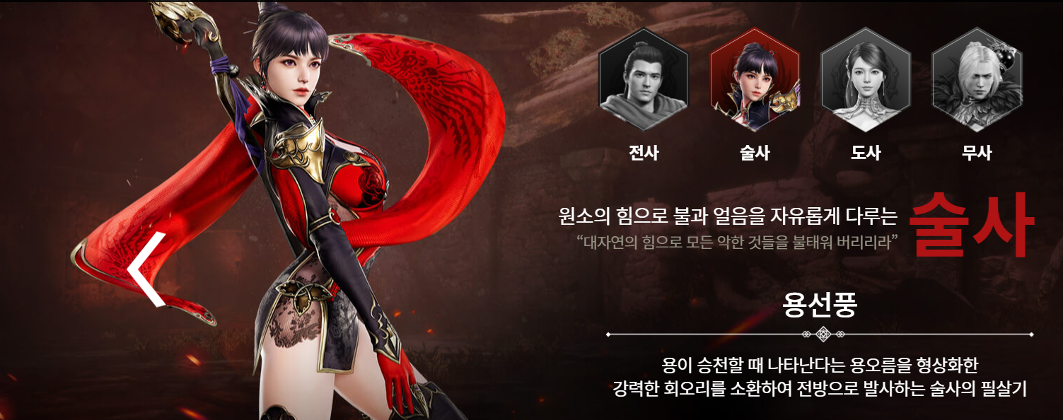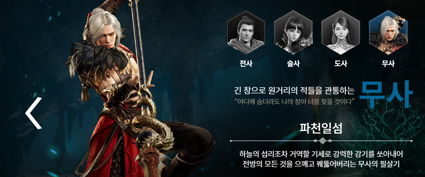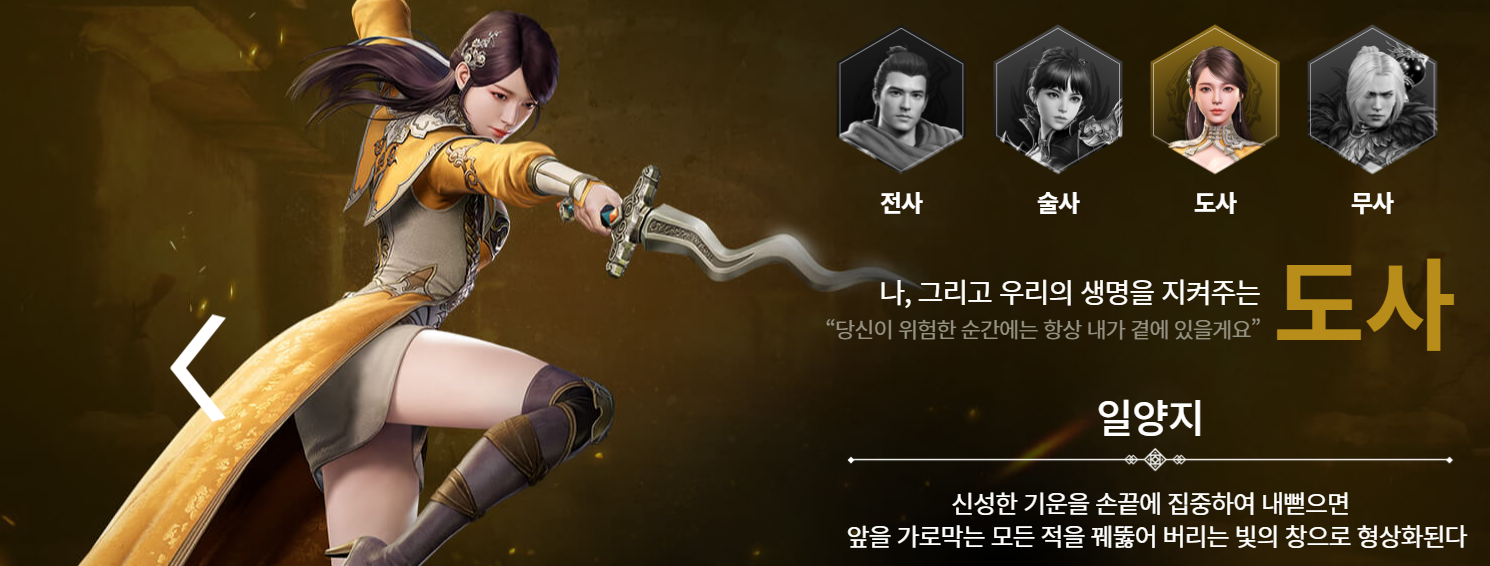 | 1. 전사 - 거대한 도를 휘두르며 적들을 베어낼 수 있는 전사입니다. 2. 술사 - 원소의 힘으로 불과 얼음을 자유롭게 다를 수 있는 술사입니다. 3. 도사 - 우리의 생명을 지켜주는 도사입니다. 4. 무사 - 긴 창으로 원거리의 적들을 관통하는 무사입니다. |