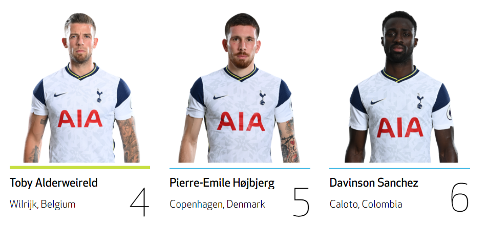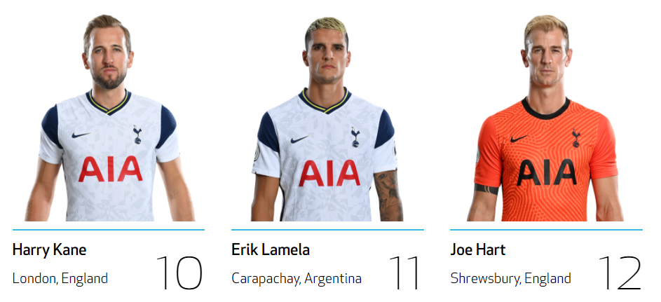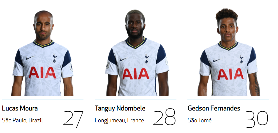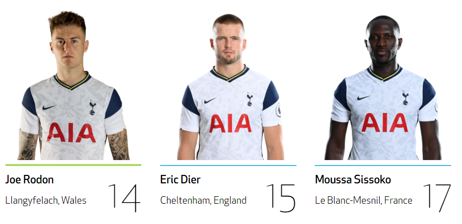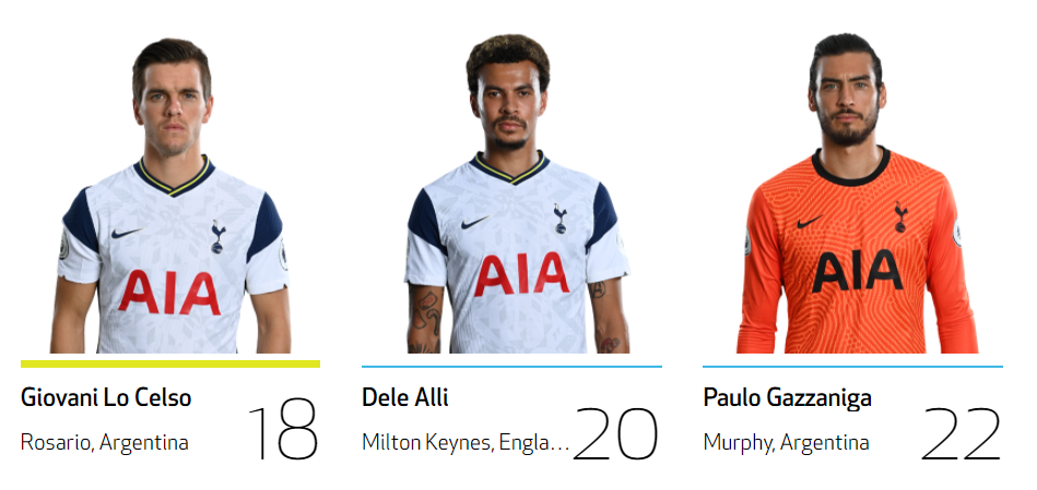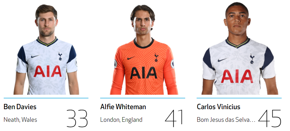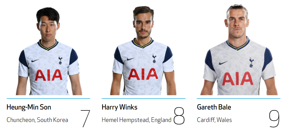 | 공격수 가레스 베일 No.9 손흥민 No.7 스티븐 베르바인 No.23 에릭 라멜라 No.11 잭 클락 No.47 카를루스 비니시우스 No.45 해리 케인 No.9 미드필더 델레 알리 No.20 루카스 모우라 No.27 무사 시소코 No.17 에릭 다이어 No.5 제드슨 페르난데스 No.30 지오바니 로 셀소 No.18 탕귀 은돔벨레 No.28 피에르 호이비에르 No.5 하비 화이트 No.48 해리 윙크스 No.7 수비수 다빈손 산체스 No.6 대니 로즈 No.3 데니스 커킨 No.49 맷 도허티 No.2 벤 데이비스 No.33 세르주 오리에 No.24 세르히오 레길론 No.3 자페 탕강가 No.25 조 로돈 No.14 토비 알데르베이럴트 골키퍼 브랜든 오스틴 No.40 알피 화이트맨 No.41 위고 요리스 No.1 조 하트 No.12 파울로 가사니가 No.22 |